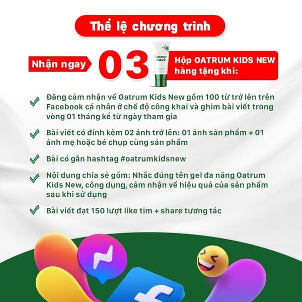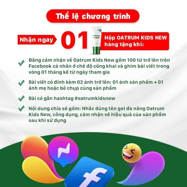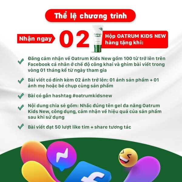 + Đăng một nội dung chia sẻ cảm nhận về gel đa năng Oatrum Kids New gồm 100 từ trở lên trên Facebook cá nhân ở chế độ công khai và ghim bài trong 01 tháng kể từ ngày tham gia.