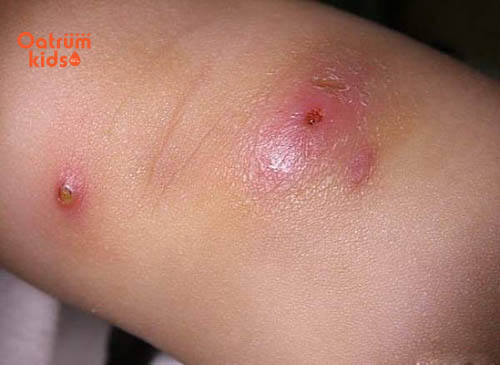 Khi mới xuất hiện, mụn nhọt là những nốt nhỏ trên da sau đó sưng viêm đỏ và lan rộng, thậm chí trẻ có thể bị sưng tấy và lớn dần sau vài ngày gây đau nhức khó chịu cho trẻ. Trong trường hợp mụn sưng đỏ, có chứa mủ còn khiến trẻ bị viêm và sốt cao.